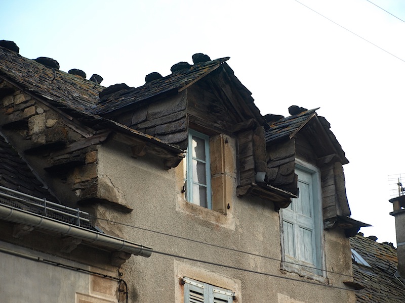There is a lot of detail in this photograph, ie, what appears to be a door (the blue one) is probably shutters covering a full length window, the ridge slates are actually keyed into each other and the two steel bars (left) above the gutter are to hold snow back.