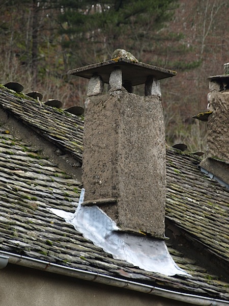 With this chimney I suspect the drip-stones came first then the lead flashing was installed later. It’s a very neat chimney top with a rock on top holding the top plate down.