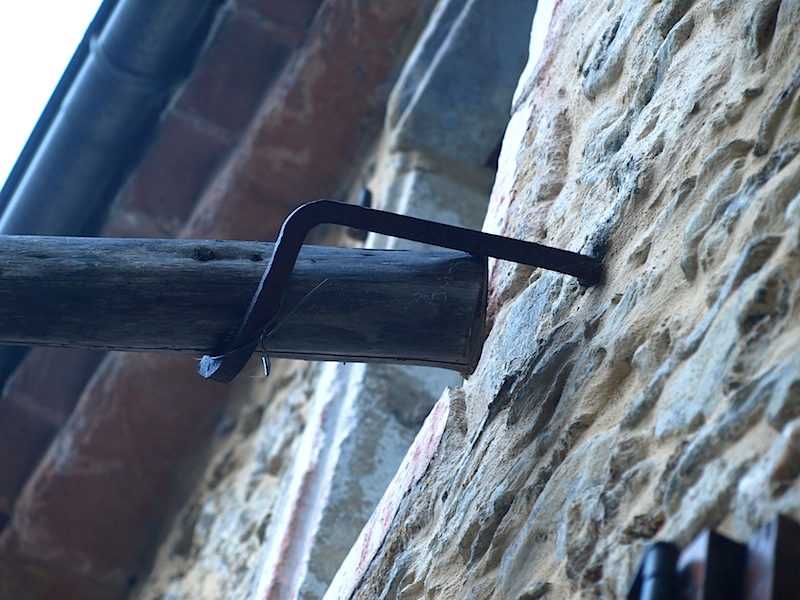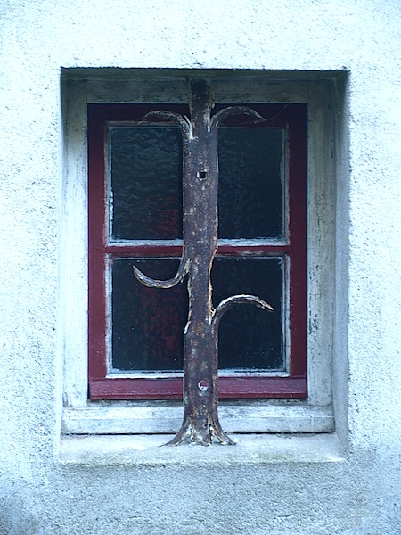 Another crafty piece of blacksmith work. A piece of flat steel bar has been split and curved outwards to form sharp lance shapes. The piece was then set into the window sill and jamb. In countries less historically aware a pressed aluminium screen would cover the whole window, which would be nowhere as visually pleasing.