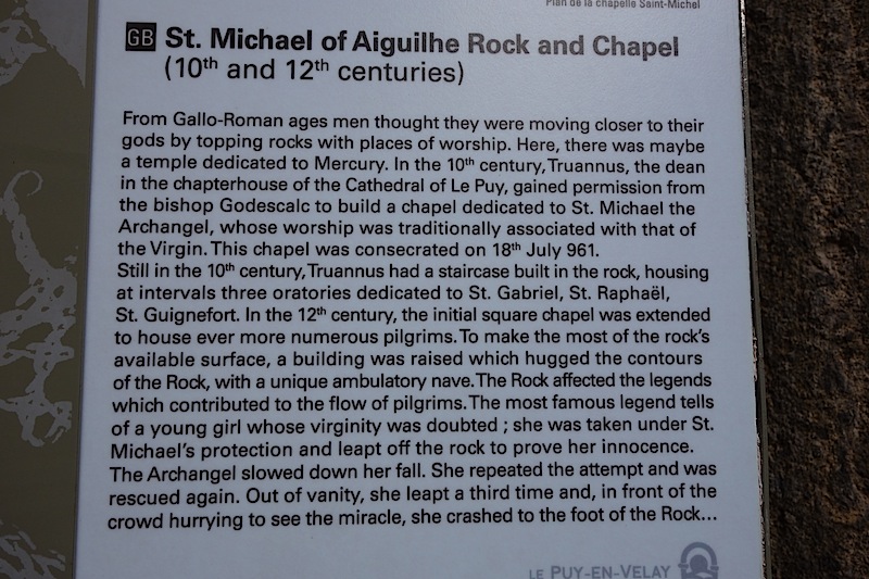 In the winter of 951, Bishop Godescalc of Le Puy returned from an overland pilgrimage (3200km return) to the shrine of St James located across the Pyrenees in Santiago de Compostela Spain. To mark his successful return he had the diminutive chapel built on top of the towering volcanic plug. I bet the workers building the chapel didn’t think it was so diminutive when lumbering the rock for its construction to the top.