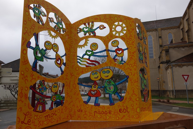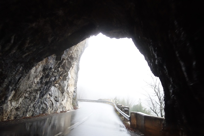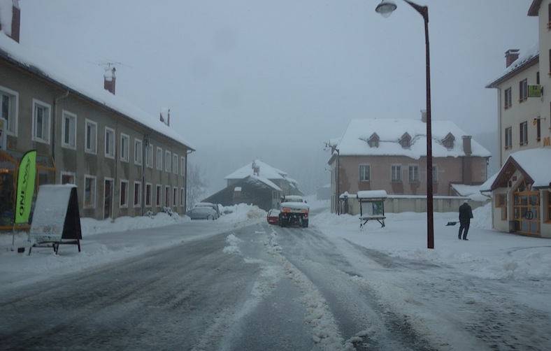 The highest point on the Jura mountains is near here and prior to coming across the signs we had two worries – were we on the right road and was the snow going to get so deep that the road would become impassable? However our worries were alleviated, as down the mountain a little way we met cars coming up a sign the road was open.