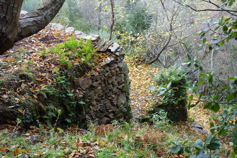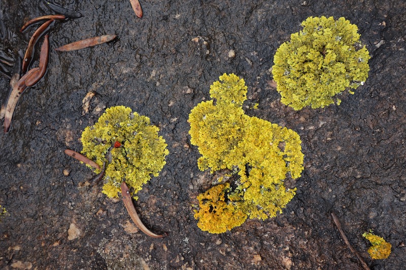 The predominant plants on this wall are lichens and mosses. Lichens are by no means a simple single plant but two plants living in a symbiotic (shared) relationship comprising algae and fungi. Lichens came into my world following the acquisition of a powerful microscope some years ago. I used it to show clients on our Backtrack tours the microscopic world under their feet. Mosses (we all love them) have a very important role and that is to break down their host (rock in this case) and release nutrients.