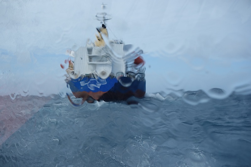 Pilot boat awash. Passing by the stern of the cargo ship we rendezvoused with.
