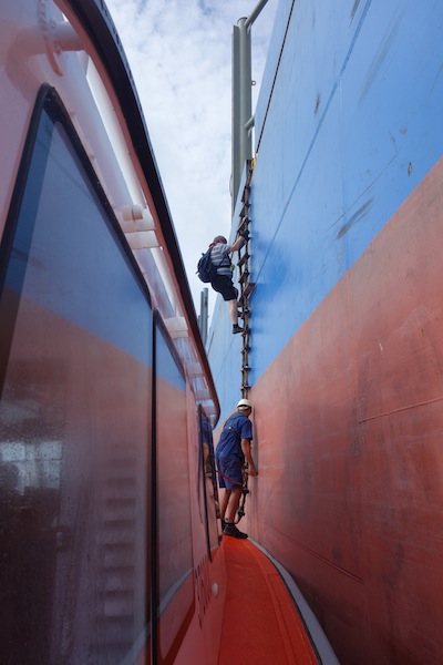 Alongside and the pilot boat deckhand testing the ladder prior to the pilot coming down.