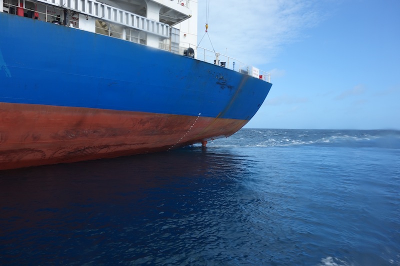 The greatest fear of a pilot boat captain is to get caught in the ‘bad news zone’.  Note how rough the sea is to the stern of the freighter.  I have a friend who owns a small flying boat and he once landed one of his aircraft in the calm area next to a freighter to pick up an ill seaman.