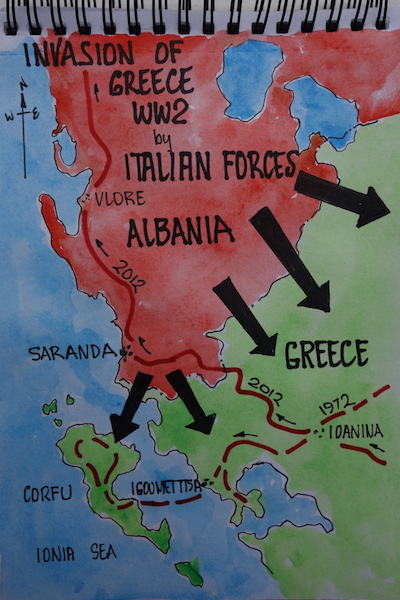 In October 1940 German troops invaded Romania to the north of Greece and this, along with the fact that Italian dictator Mussolini was demanding the use of Greek naval bases in the south, was of great concern to the Greek government and people. When Mussolini was denied access to the naval bases he attacked Greece through its northern border with Albania. Bev and I passed through the area in 2012 during our Encountering the Past Odyssey Part 1.