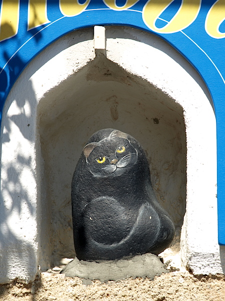 There are many cats on Kythera but this stone one took my fancy. The rock was very carefully chosen to simulate a curled up cat, it had just the right curves and indents. Whoever conceived the idea and painted this had a great imagination. Brilliant work. On a personal note, I included this image for our Kate, an artist and cat lover. All around Kythera there are subtle pieces of artwork in stone, glass and wood.