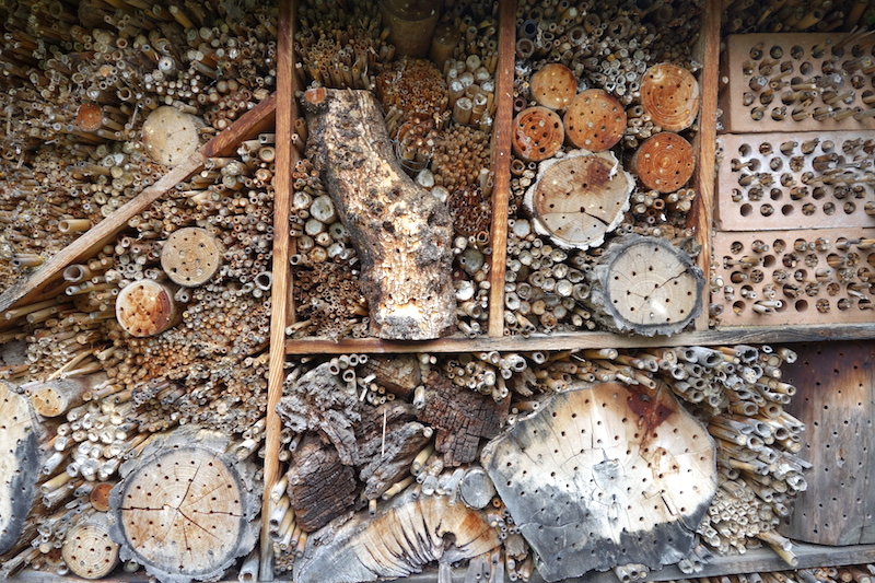 The curators of Papiliorama, advocate that everybody should establish insect houses like this one on their properties. The four holes in the bottom right block of wood have been daubed. Mud dauber wasps have laid their eggs in the holes then sealed them with mud. The pieces of bamboo, in the middle level, have also been visited by insects.