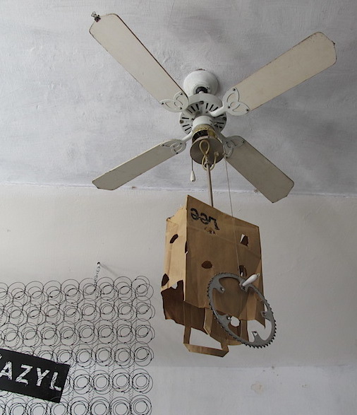 A very creative lampshade configuration. I think the drive sprocket attached to the bag was to stop it from flipping up when the fan was going.