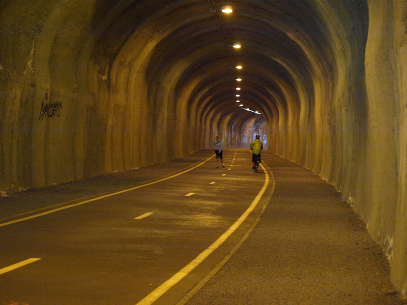 Bev loves tunnels because it’s easier to ride through a mountain than over it. Riding through dark tunnels like the one above is a very good reason to have lights on your bike.