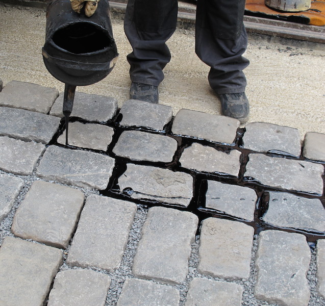 Filling in the gaps between the settes. Settes are the squared stones. It would not do to have one pop out and land on the line.