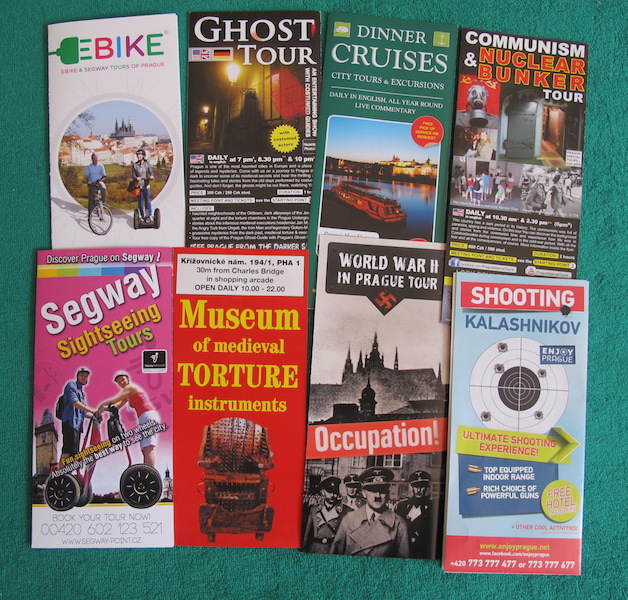 A few of the many Prague tourist brochures, some inviting tourists to explore the dark eras of Prague, fire a Kalashnikov high-powered weapon or command a military tank.