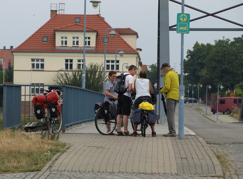Bev, the German couple and a local discussing where the start of the bike path to Frankfurt (Oder) might be.