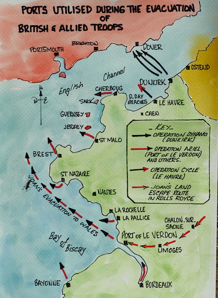 Fortunately Joan kept a detailed diary of her experiences and following are some extracts from her diary relating to the run she made to the Port of Le Verdon (on the shores of the Bay of Biscay) from where she was evacuated to England.