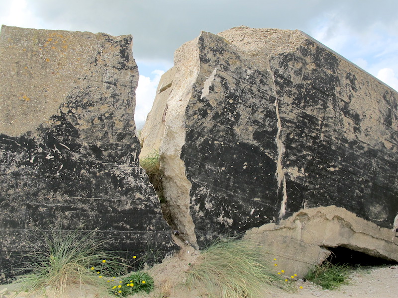 A gun emplacement with its back broken. Imagine the force required to snap this concrete mass in half.