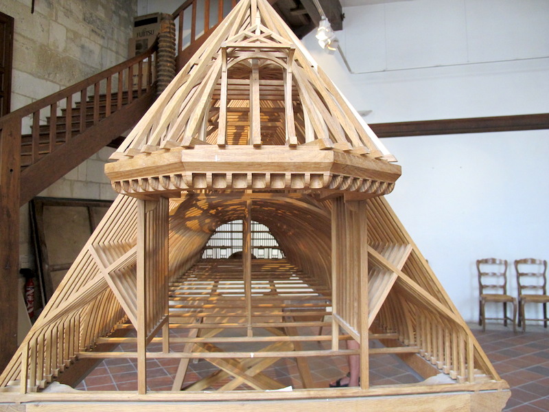 The sign on the roof model stated: la Societe des Compagnons Charpentiers des Deroirs du tour de France d’Orleans. I’m grateful to the Society of the Companion of Carpenters for building the model. Had I not seen above the ceiling and how the roof was built it would have remained one of life’s mysteries and I do not like mysteries of this kind. I would like to get up in the roof and walk among the timbers some time though. Next time maybe.