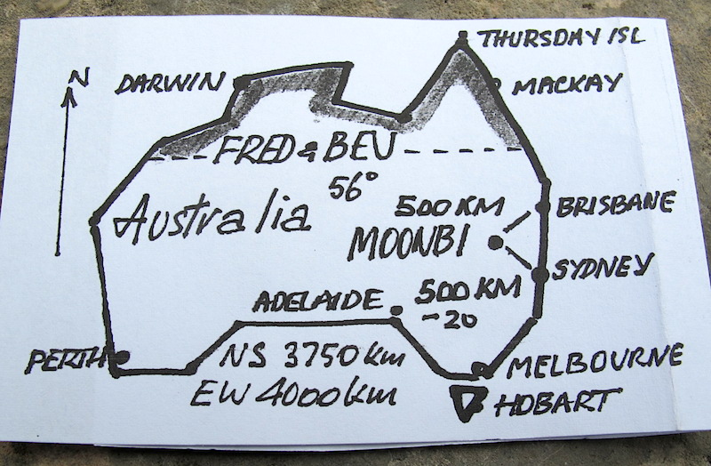 Because we were constantly being asked about crocodiles I prepared a card similar to a business card (shown in photograph below) indicating where crocodiles live. The shaded area above the dotted line in the following image is croc country. Also on the card is shown answers to other questions we were frequently asked…maximum recorded temperature 56 degrees C, coldest temperature minus 20 degrees C and the length and breadth distance of the Australian continent. Over the past seven months I have given out about three hundred of these cards.