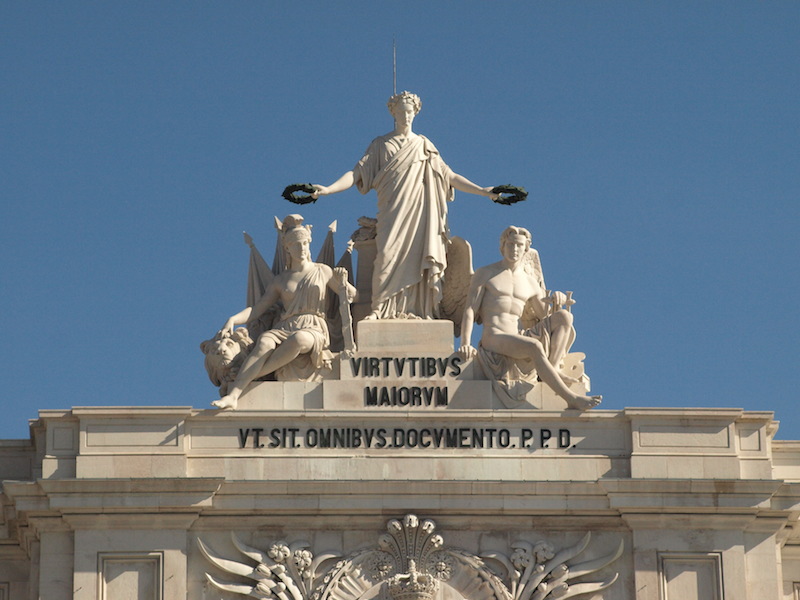 The figure on the top of the Trimphal Arch handing out laurel wreaths is an allegory to Valour and the reclining figures represent the rivers Tagus and Douro. Figures representing two rivers is a stretch of the imagination, maybe it is artist’s licence. The Tagus (Tejo) lies on a geological fault line and in parts is the border between Portugal and Spain. It is the longest river on the Iberian Peninsula. The Douro River is located in the north of Portugal and it flows into the Atlantic Ocean at the town of Porto. It is the third longest river on the Iberian Peninsula after the Tagus and Ebro Rivers.
