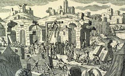 A copperplate engraving showing persons being hanged after the Lisbon earthquake. Image in the public domain, transferred from Wikipedia.