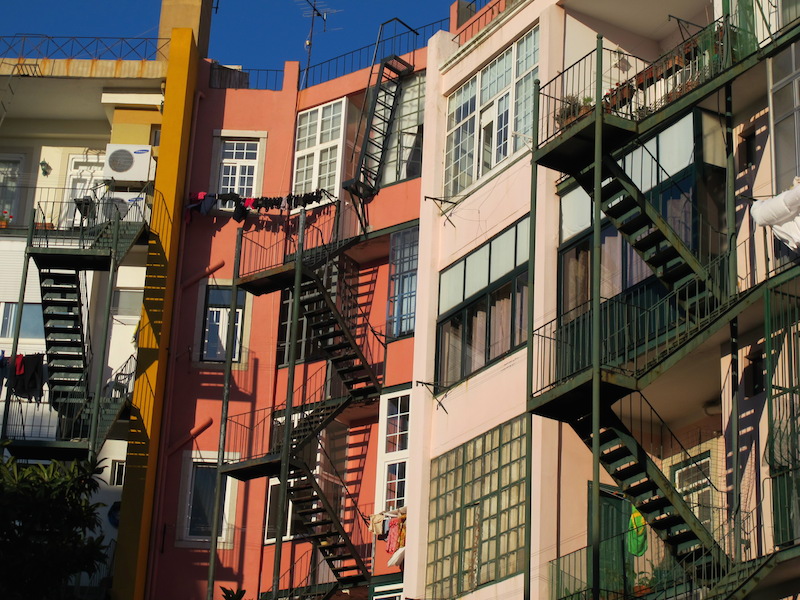 After many distractions, looking at ‘things’ we made it to the Lisbon Gambori hostel. We were met at the door by Binod, a native from Nepal who has been living in Lisbon for three months. He insisted on carrying our bikes up the one floor to our lodgings saying as he went, ’In Nepal we respect old people and I am strong’. The hostel suits us fine as we have a double bed, access to a kitchen and a balcony with tables and chairs. The view from the rear balcony is of interest as it joins the rear of adjoining apartments.