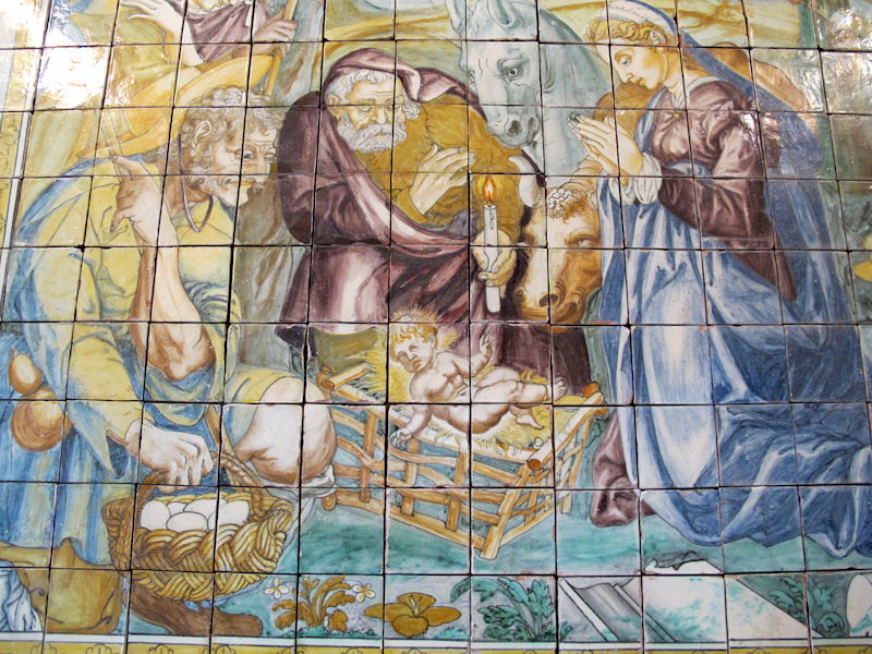 Lisbon’s Tile Museum is incorporated into the former convent of Madre de Deus. Of course there are many tile murals depicting biblical scenes. Such scenes are more difficult to create than geometrical designs. An example of fine work is shown in the following nativity scene.