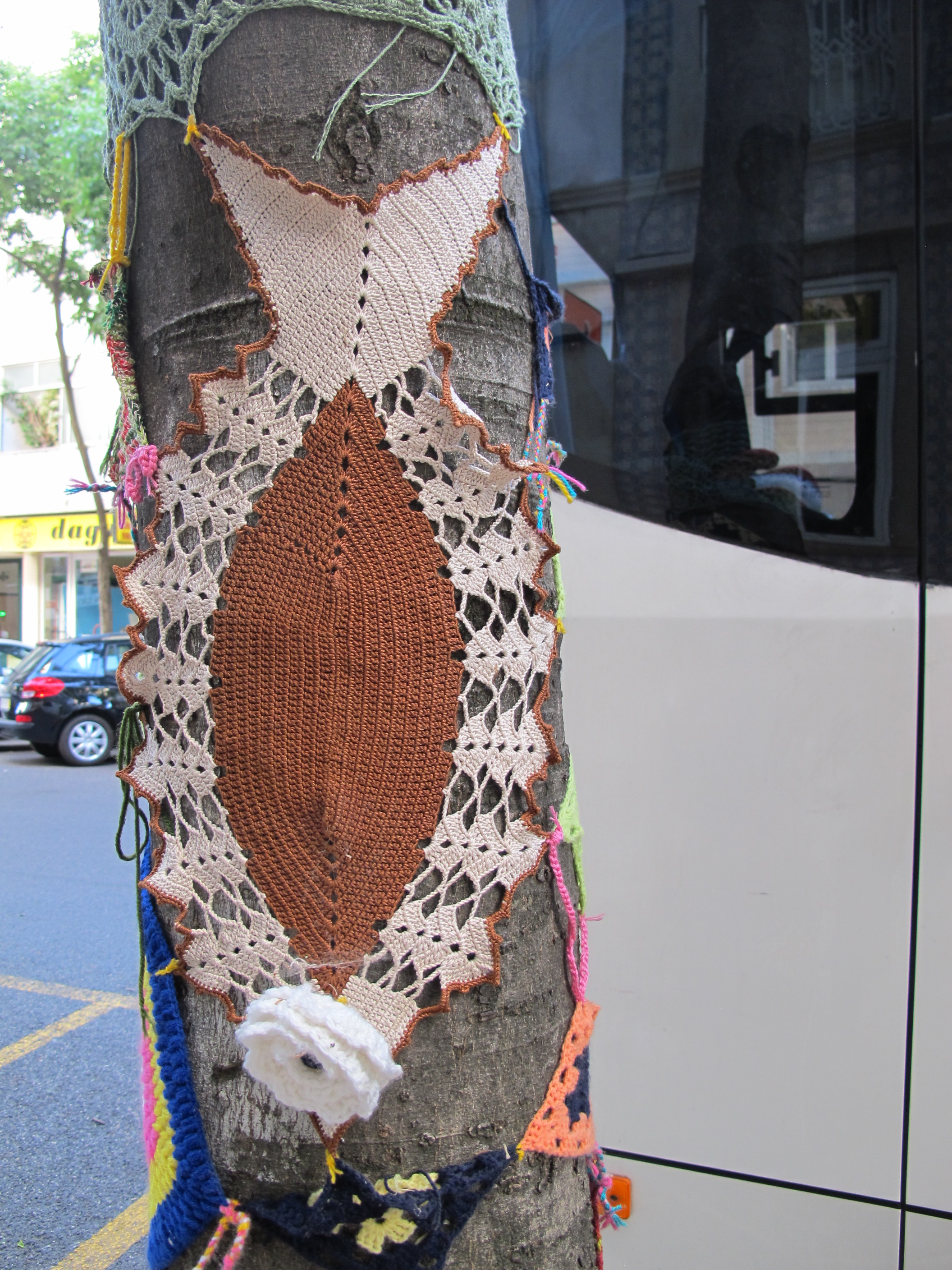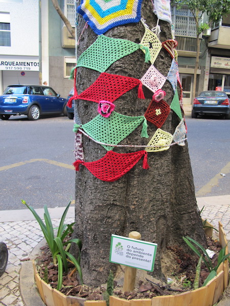 Sometimes when travelling in foreign lands one comes across oddities that defy comprehension. For example, when out and about Lisbon we came across pieces of colourful crochet work wrapped around a number of street trees.