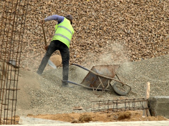 Having the wheelbarrow on its side meant the superman worker didn’t have to lift the shovel full of gravel up and over the edge of the barrow. When it was half full he stood the wheelbarrow up and filled it to the top, saving time and effort.