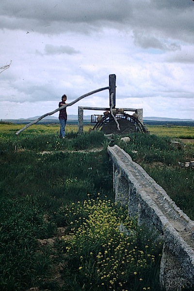 Bev coming to understand the donkey-driven water lifter and the hand-hewn granite water distribution duct.