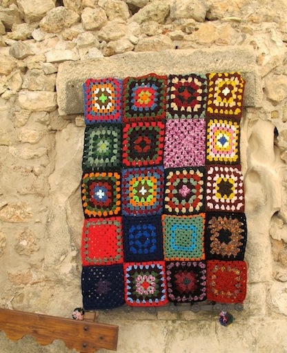 Granny square art: Often grannies have spare time so they while away the day crocheting squares like the ones above from scraps of wool. The squares are then sewn together to make a blanket.