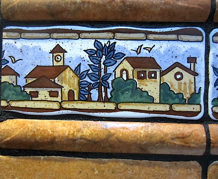 Loo art. These tiles were part of a narrow band of tiles running around the inside of a toilet. The overall height of the blue portion was about 50mm.