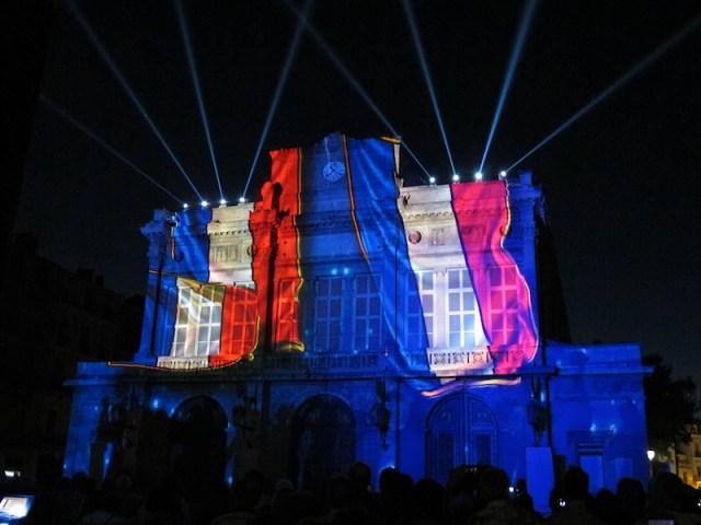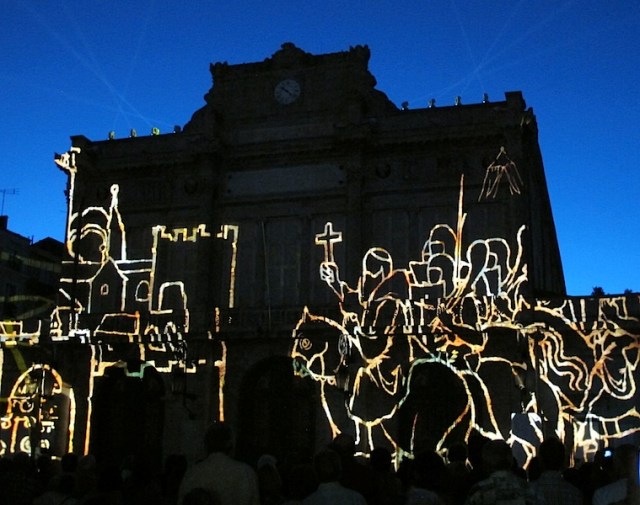 Previously I mentioned that the French take their history seriously and to get the message across as to its glorious and tragic past in the Beziers region a fabulous Sound and Light show was staged on the facade of the Municipal Theatre and surrounding buildings. Bev and I had never experienced such an event before and we were astounded.