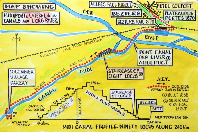 We met with two local residents Timo at the bike shop and Michelle. Timo is an expat Dutchman who has chosen to live and set up shop in southern France. Beziers was his choice over the busier and more expensive areas around Montpelier to the east. Michelle was born in France but spent many years living in Florida USA but she and her husband returned to Beziers because in her senior years Florida was not the place she wanted to be. It was far too hectic. Over the last three years Bev and I have met a number of long time travellers and Michelle was one of them. She had many travel stories to tell and one that remains with me was when she and her husband were travelling in the 1970s on a bus in South America and bandits boarded the bus with guns. One gang member carrying a bucket with a million dollars in it offered Michelle’s husband the million for Michelle. After negotiations Michelle’s husband convinced the bandit he didn’t want to sell her.   I suggested to Michelle that she should write about her travel experiences. If she does I will add them to this post at some future date.