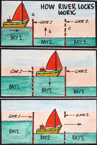 HOW LOCKS WORK: The boat waits in bay 1 while bay 2 fills with water. When bay 2 is full Gate 1 is opened and boat moves into bay 2. Water is drained from bay 2 into bay 3 then gate 2 is opened and boat proceeds onwards.