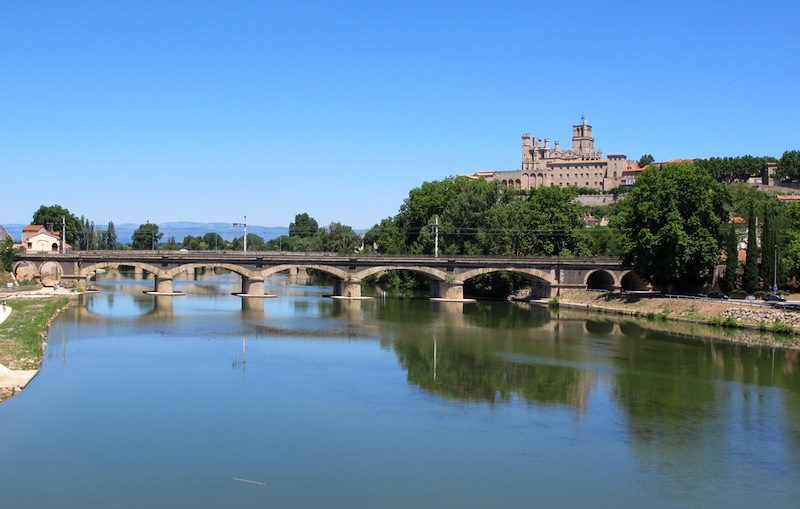 Railway bridge across the River Orb and the Beziers St Nazaire Cathedral.