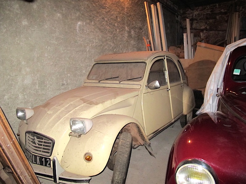 The French cult car, the Citroen 2CV, gathering dust and no doubt increasing in value.