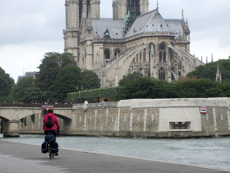 Bev approaching Notre-Dame Cathedral from the chancel end. The delicate flying buttresses supporting the chancel walls are a fine example of the art.