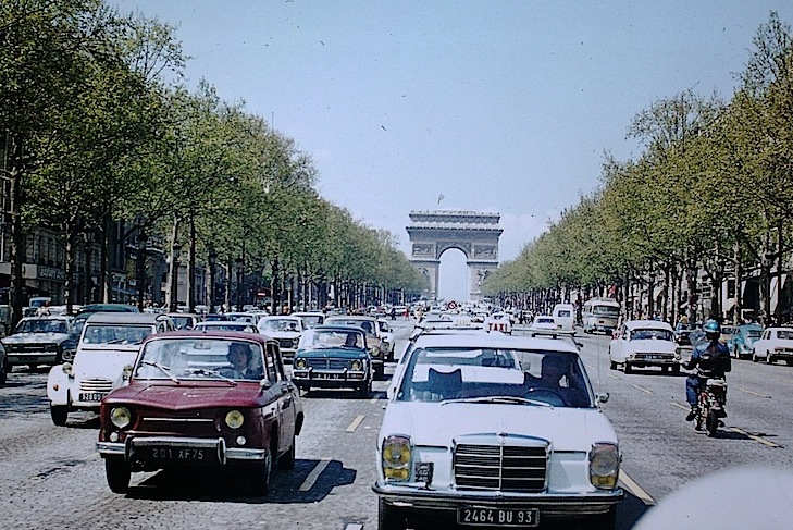 The Champs Elysees and the Arc de Triomphe 1973. I love the vintage cars of the ‘Golden Age’. I took this photograph out of the rear window of our VW Beetle.