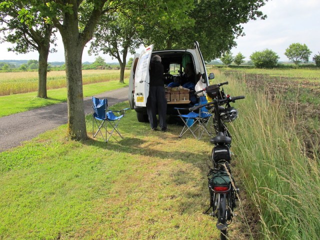 From Oxford we pushed on northwest passing through the hamlets of Farmoor and Bloxham. Bev has a dislike for making camp in the dark so on this odyssey I decided to pull up early if possible. At a tee intersection that I later learned was called Policeman’s Tree Corner I spotted a farmstead on a rise and leading to it was a magnificent row of oak trees. Not wanting to go anywhere near official camping grounds I thought a camp on the edge of the oak tree drive would be a very satisfactory free farm camp.