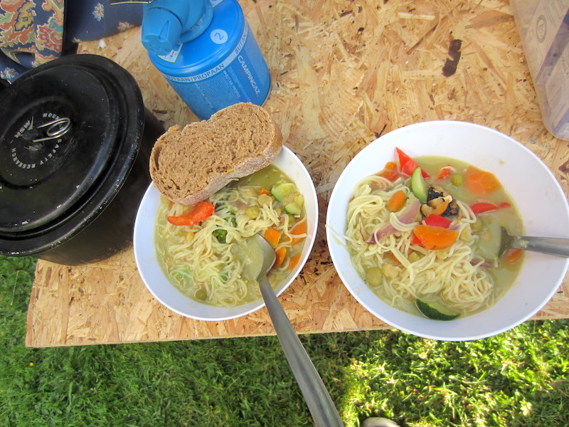 Noodle and vegetable soup, another cheap but healthy dinner served on the retractable table at the back of our van.
