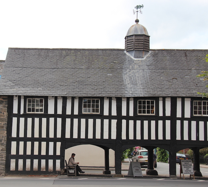 The half timbered 17th century market hall at the bottom of the high street in Llanidloes Wales.