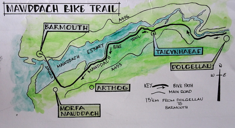 Map showing the fifteen kilometre long Mawddach Bike Trail.
