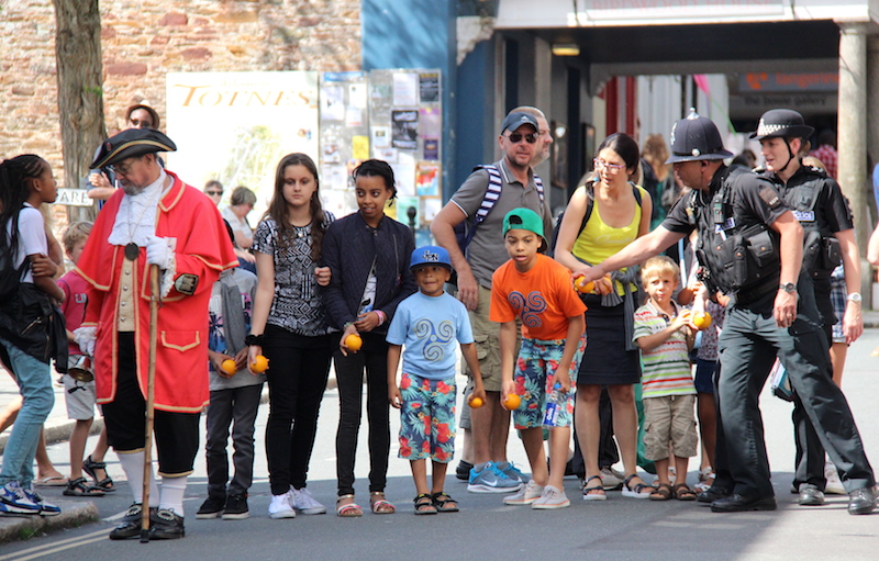 The local constabulary and the town crier getting the starters in line for the orange race.