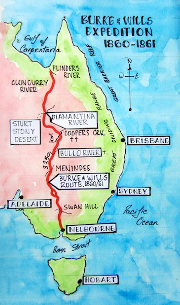 Map showing the Burke and Wills Expedition route. Both Burke and Wills died on the banks of Cooper Creek.