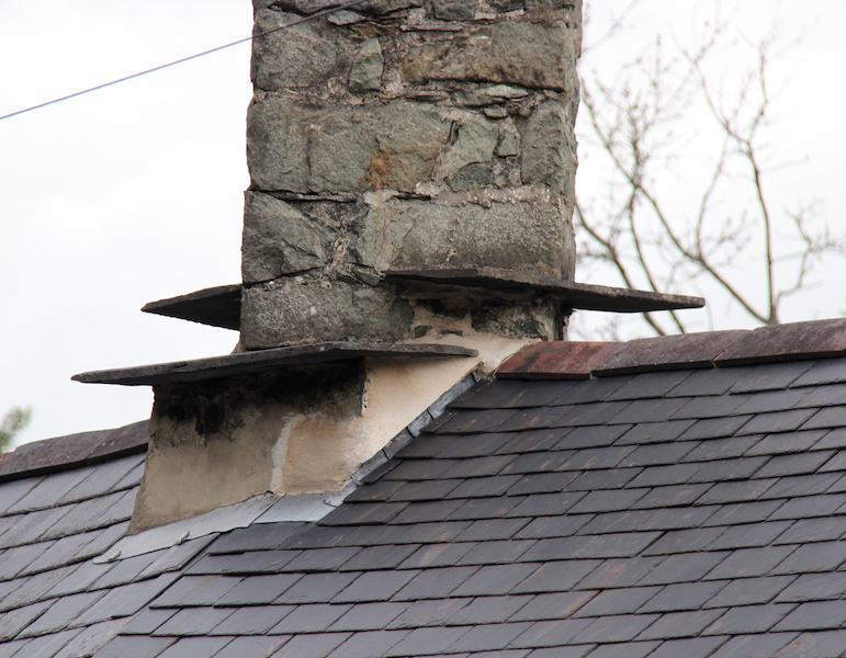 Slate used as dripstones. Dripstones deflect rain running down the chimney away from the roof flashing.