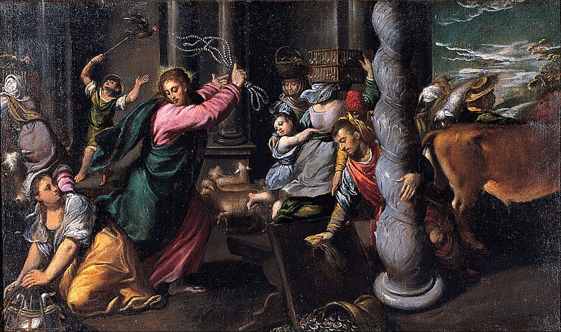A 1580-1585 painting by Sarsellino depicting Jesus driving merchants from the temple.
