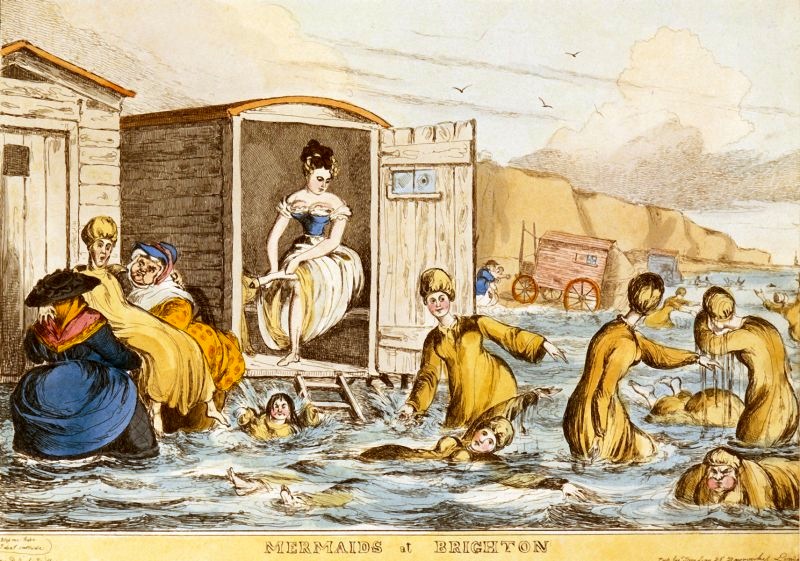 Mermaids at Brighton (England) swim behind their bathing machines. Engraving by William Heath circa 1829. Image credit: In the public domain. Author Playtime via Wikipedia.