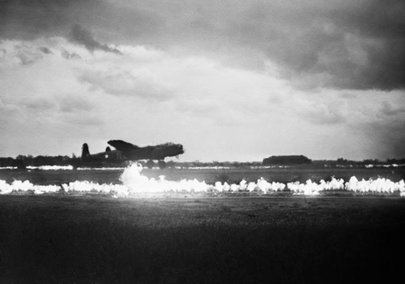 FIDO in operation as an Avro Lancaster takes off in deteriorating weather in 1945. Image Credit: Imperial War Musuem via Wikipedia. Photograph by Flt Lt Goodchild A.