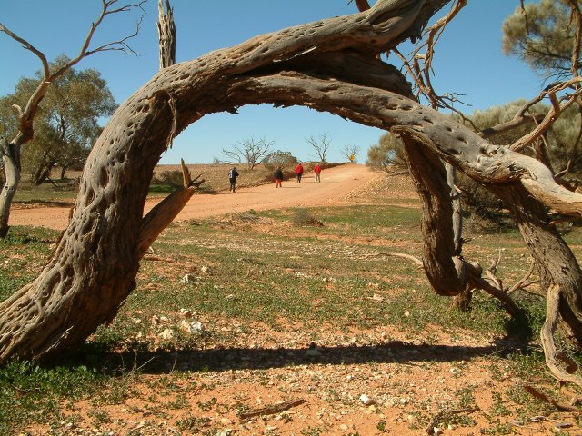 Clients taking a walk after lunch. The dead tree in the foreground is a mulga (Acacia aneura).