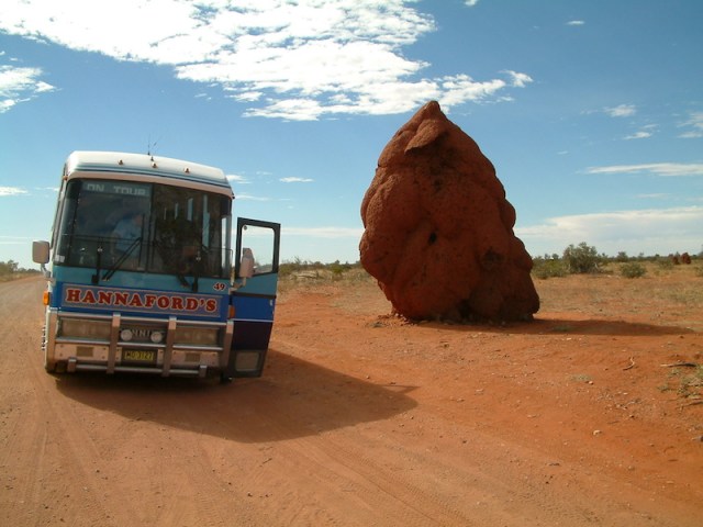 Termites are not ants, although they are often referred to as white ants. They can be friend or foe: foe when they want to devour your house and friend when they eat fallen wood, turning it into valuable fertilizer. Some woods are too hard for termites to eat or contain repellant oils, which are not to their liking. Softer woods such as oregon are particularly attractive and there is a saying, ‘if you don’t want a piece of oregon eaten by termites you have to carry it around on your shoulder’. The termites living in the above mound eat spinifex grass, which grows in most outback regions.