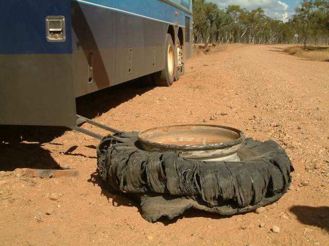 Many of the roads we traversed when on tour were unsealed graded roads, some were rough and stony and the hardiest 4WD enthusiasts we met were amazed that we would negotiate such roads with a seventeen tonne coach. There was the occasional problem. The next photograph shows one event relating to stony roads.